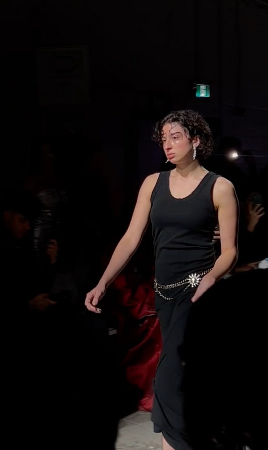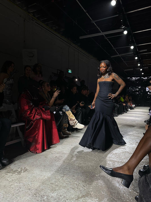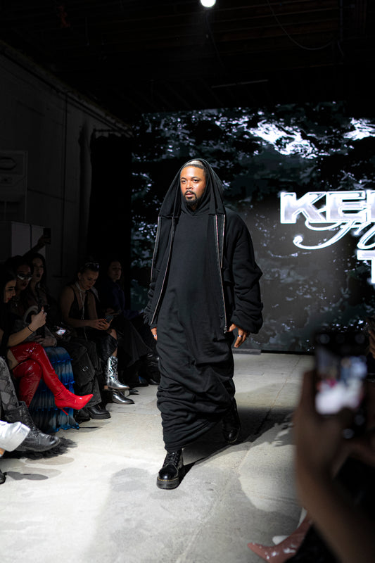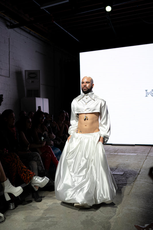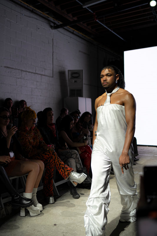 In 2022, I came out as a Gay Demi-Sexual Man. Since then. it has been an ongoing journey to learn more about who I am, what I want, and what spaces I want to participate in. This collection starts with all-white looks, white typically symbolizing purity. A commentary on how ignorance is bliss. Then that's followed by a very intense, punk look. A representation of my eye-opening journey of coming out, and how that introduced me to the thinking of activists and change makers. Finally, finishing with all-black looks, a KENDRICK TRAN signature look. Symbolizing my coming into myself, becoming who I am today.