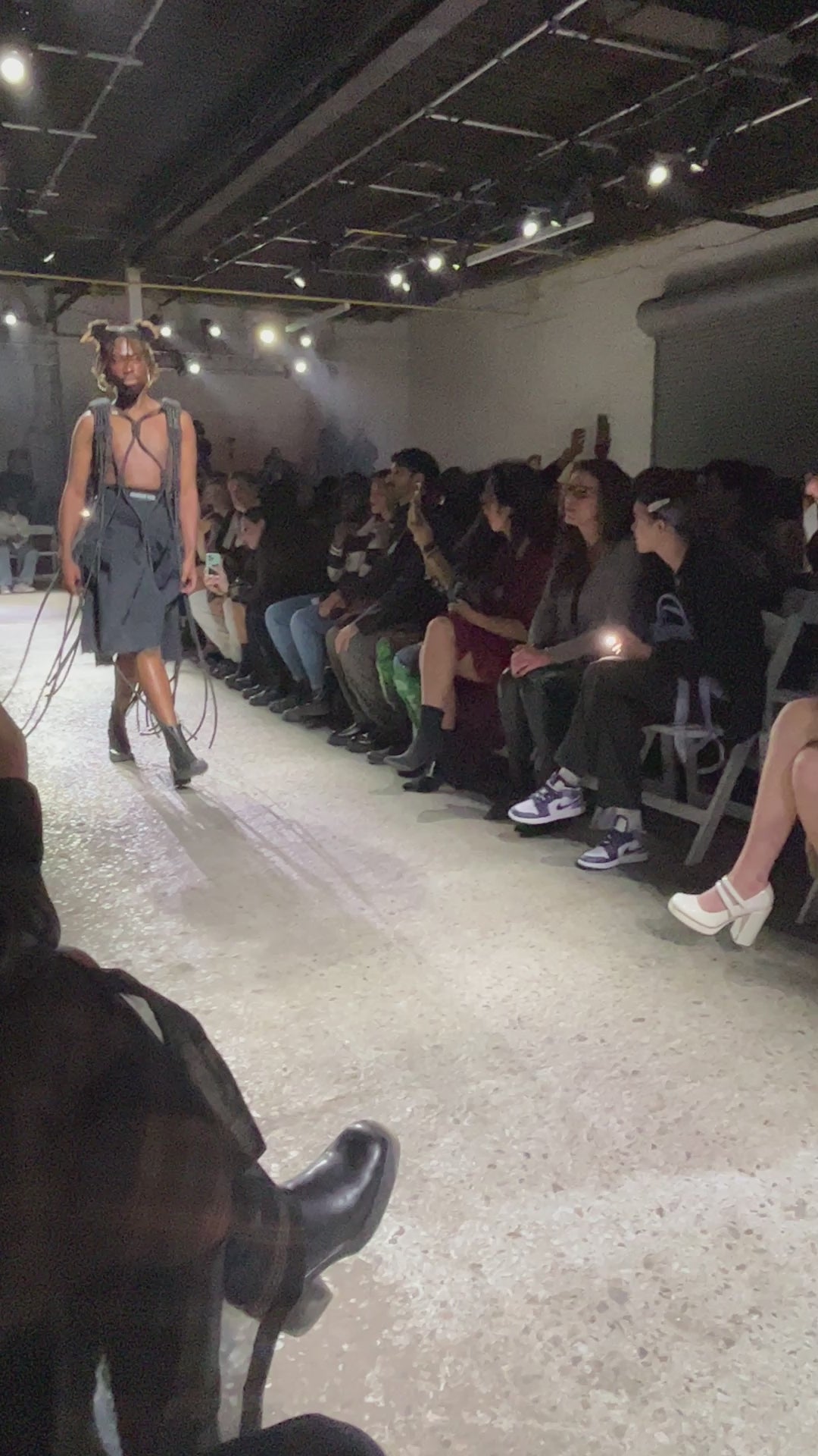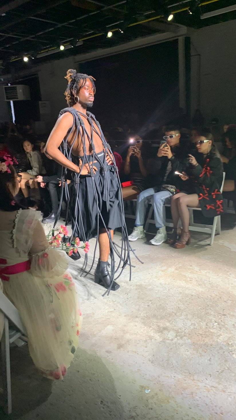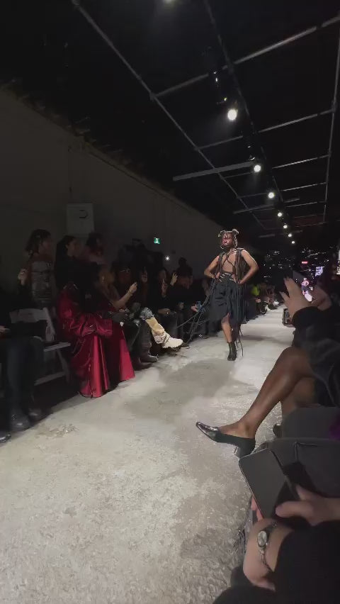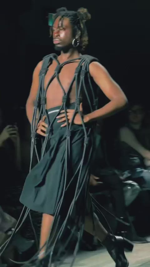 Something that surprises a lot of people about me, is I grew up camping. Despite my pretentious city boy look, I feel the most at peace in nature. I used to always be the one prepared for an adventure. Always carrying a Swiss Army knife, disinfectant spray, and wore a braided paracord bracelet; which could unravel into about 10 feet of rope for survival if needed. When I think about the queer coloured experience. I think about survival. A lot of people in similar situations as myself, are often forced to live in fight or flight mode. Either be authentic and face potential judgement from your families, or play a role in order to survive. The idea was simple, turn that bracelet I wore as a child into a dress. Each knot is individually hand tied and then bonded onto the vertical pieces of rope. Creating the imagery of barbed wire or a fence; representing the injustices that continue to happen to innocent members of our community. Styled with THE ICONS: MIDI SKIRT placing my label now on the front. Not only sitting perfectly in the loops, but giving off this feeling of my clothes being unattainable or guarded.