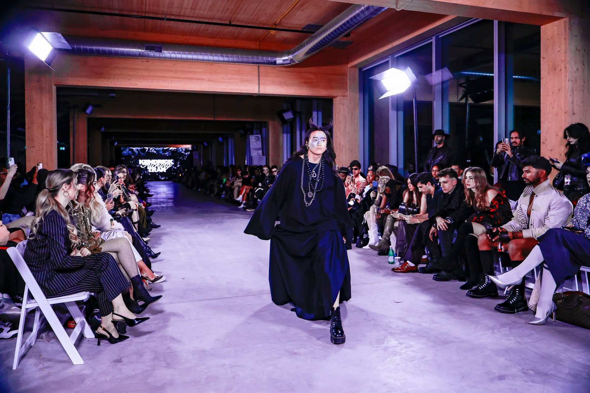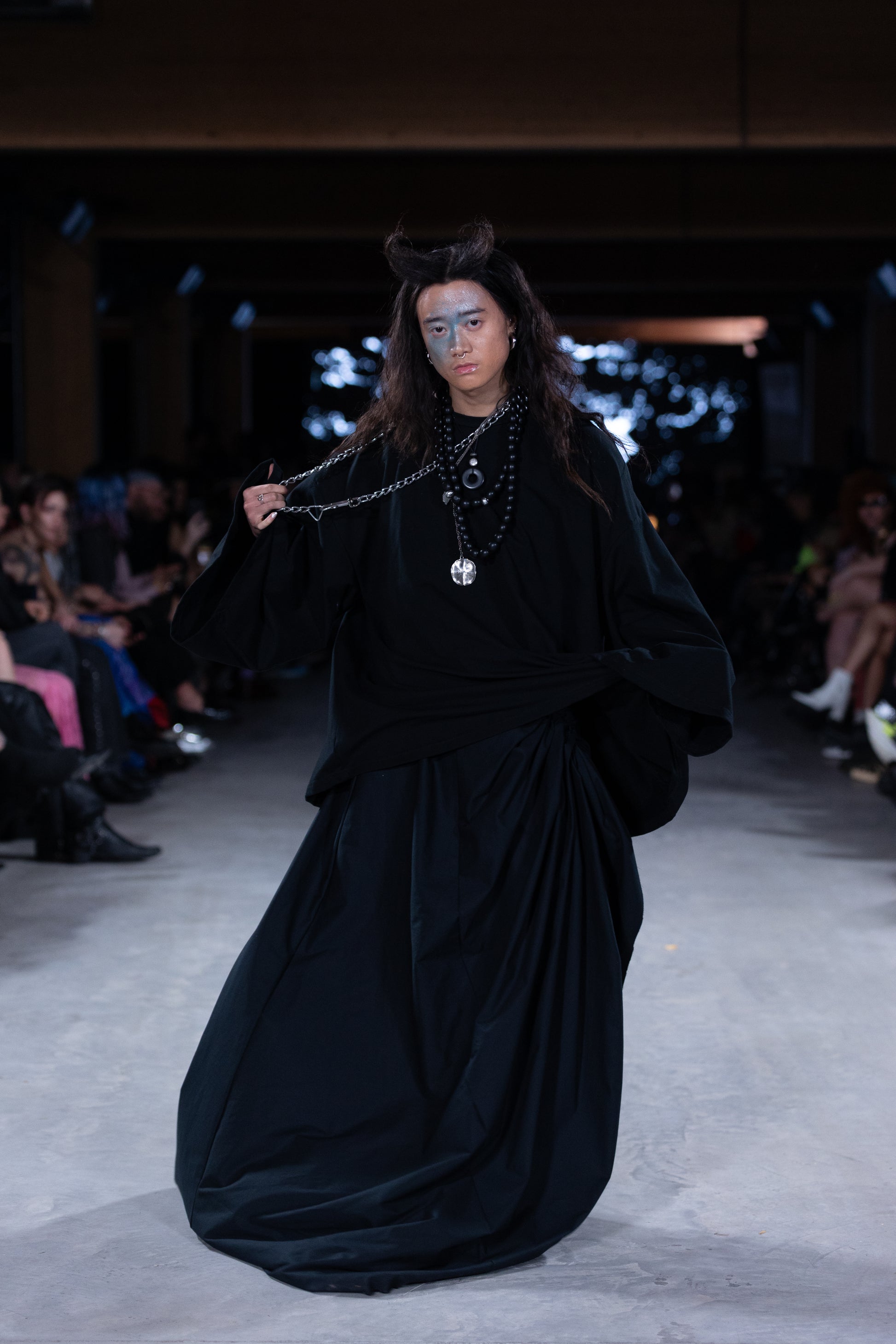 Then, on the bottom, We have a panelled a-line skirt with handstitched stacks on the side to expose the leg. Inspired by the lifestyle of going to work, then to events and then to afterparties. The pulls are added on the side to illustrate the idea of wearing a long skirt for an event and then trying to pull it up the entire night while you are dancing.
