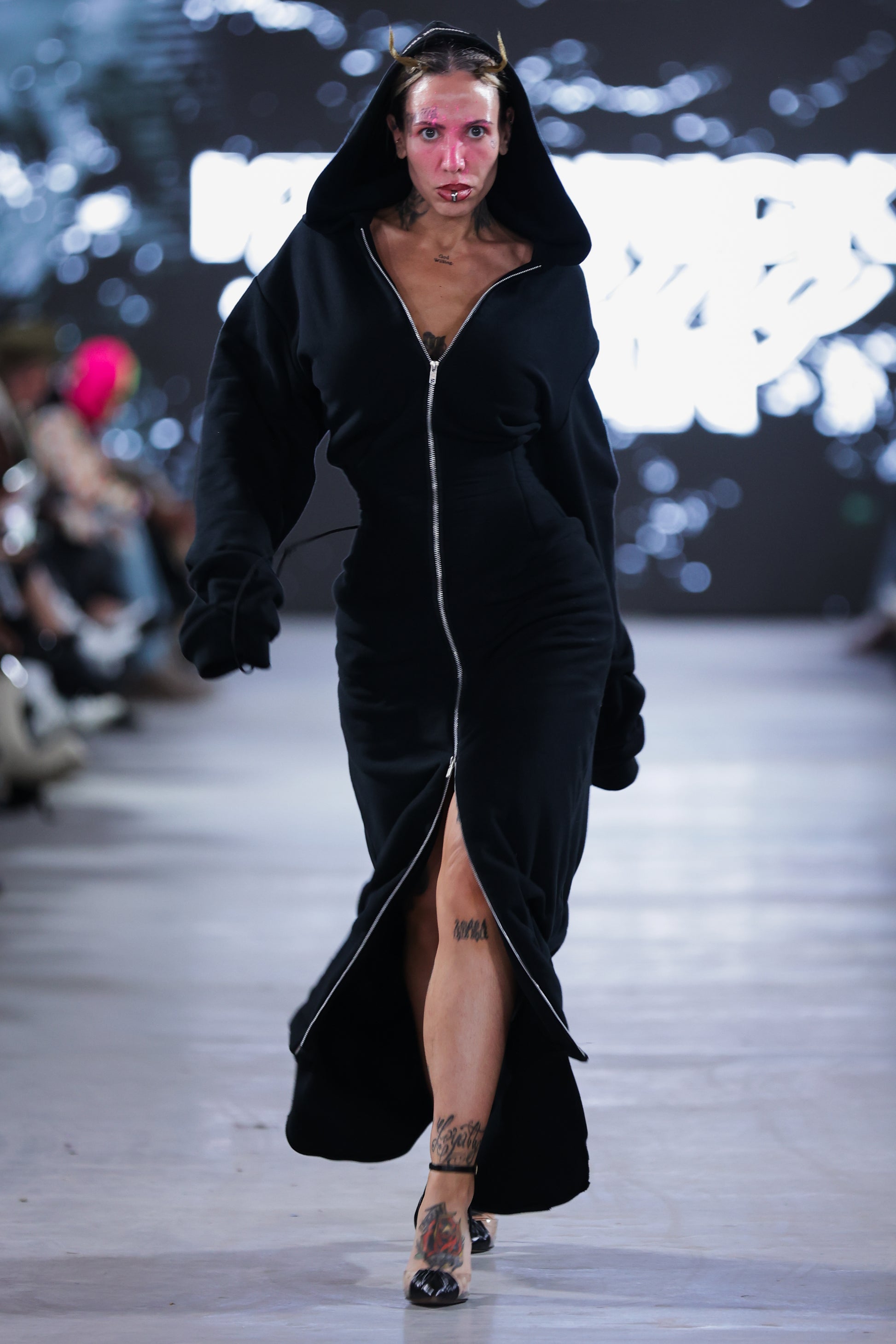 This season I wanted to bring it back in a completely new way. I thought “let’s make a giant double faced zip up hoodie dress, that is fitted to the waist and has a double ended zipper so you can play around with how you wear it.”