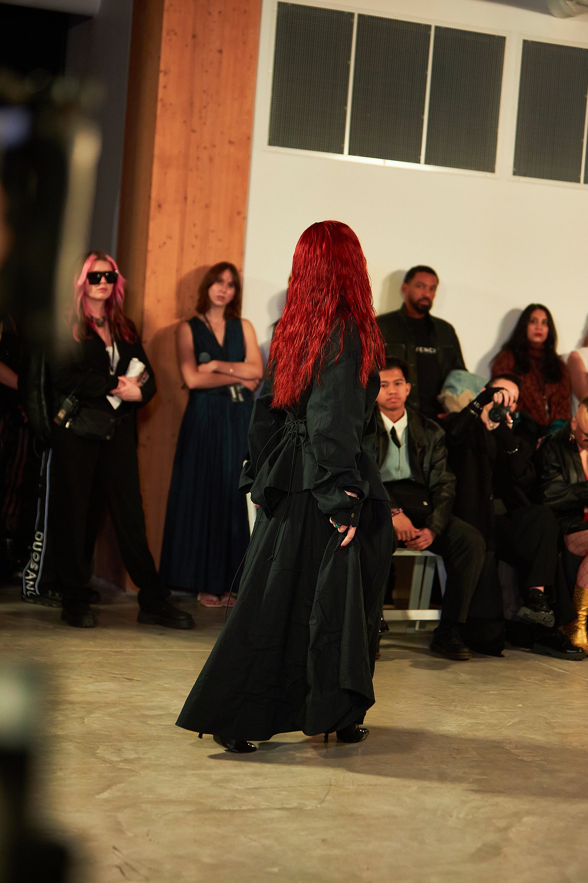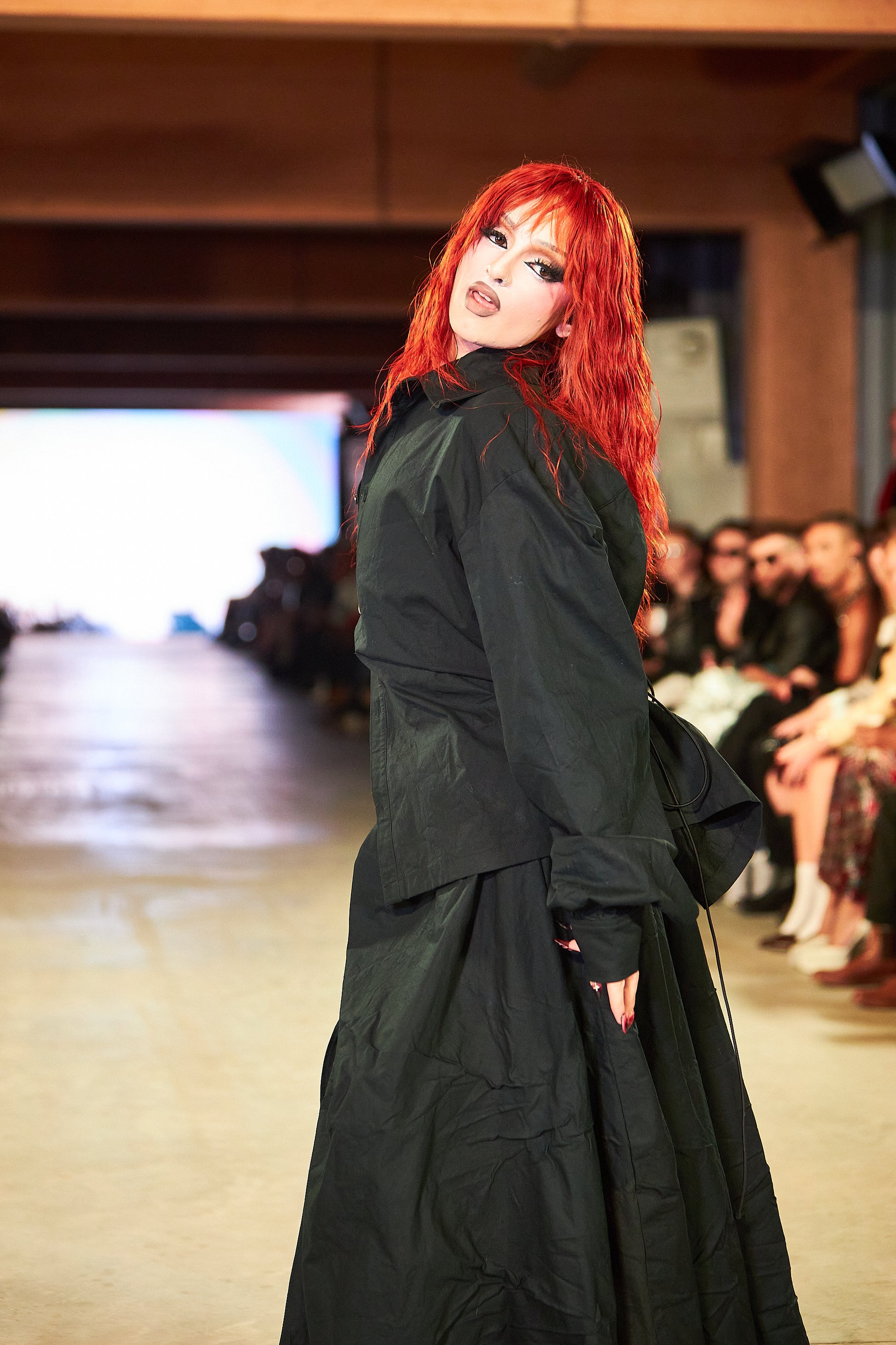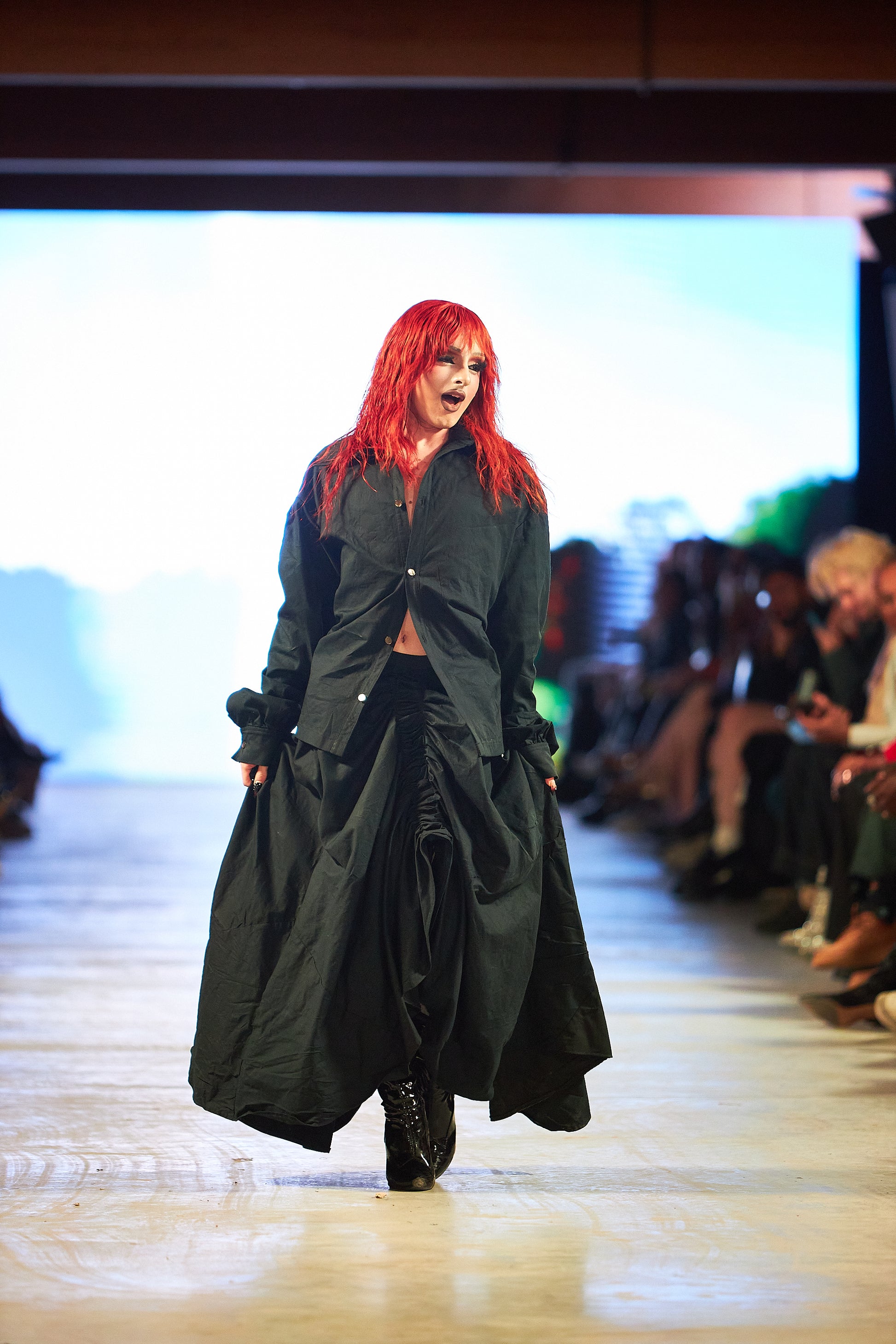 On the bottom, we have a giant circle skirt with ruching all up the front of it. The idea was to play on the idea of “Big D*ck Energy”. Pulling all the focus to the crotch. On top is an oversized button-up with paracord loops sewn on so you can wear it like a corset, open (like we did on the runway) or oversized. Made of two layers of twill, fused messily to create permanent folds and crinkles. We made sure to step on it right before we put it on, to make sure you get that authentic crushing feeling.