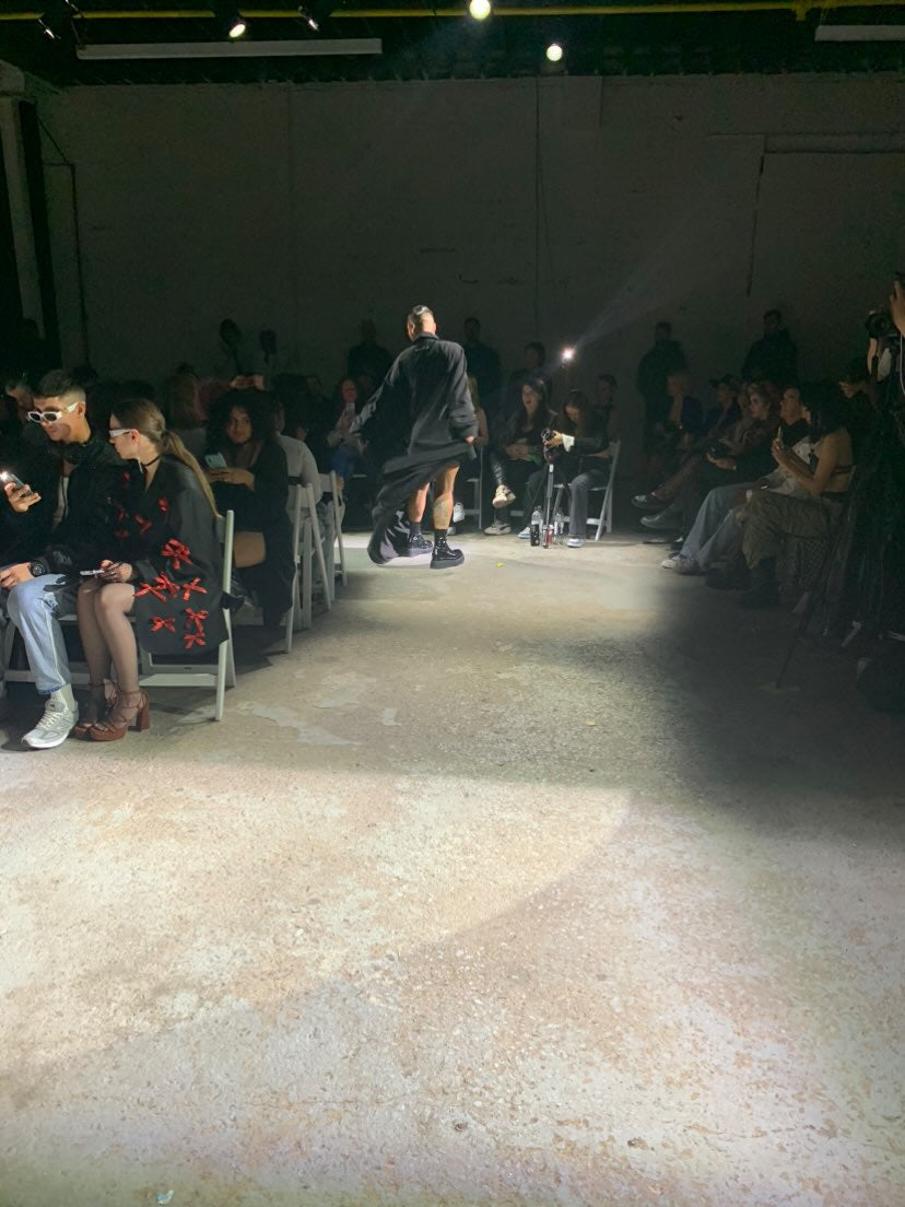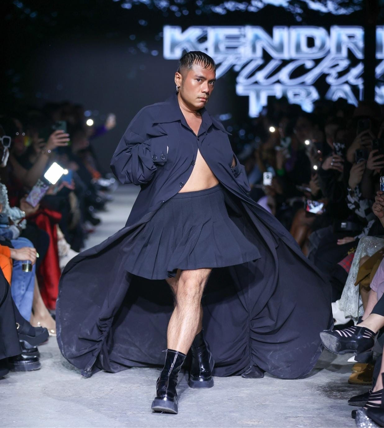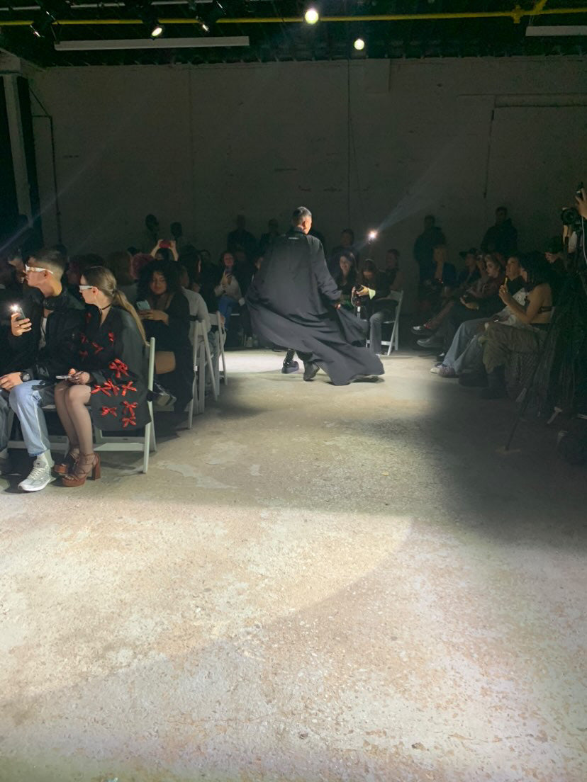 It was really important for this part of the show to open with this look. When I think about my journey of discovering who I am and refining that voice I have inside. The one that wants to fight for others, be bold, make statements, and stand up for what they believe in. I think about Huan entering my life. Let me take you back a couple of years, I was a lower middle-class gay Vietnamese boy born to immigrant parents. I still am a lot of those things of course. But these words never meant anything to me before. Being queer, being Asian, being an immigrant, was always just words to me. Words that made me feel like I was lesser than them. That my voice deserved to be silenced, I was very soft-spoken and shy (unless you knew me really well). His radical way of thinking, I guess you could say… literally woke me up. Someone asked me the other day “How are you so confident?”, I said “it’s not about confidence. It’s about having something to say and being brave enough to say it unapologetically”. This part in the show is when everything changes from white to black. This look is inspired by the two main things he has taught me. Take up space, and be a cunt… The jacket is the same jacket from my RTW “THE ICONS” collection. Simply made 10x larger. Designed to flow and move when you walk, the train is tacked on the sides so it looks stacked while static and catches air while in motion.