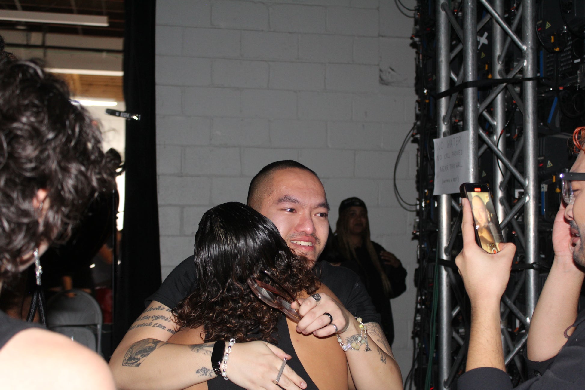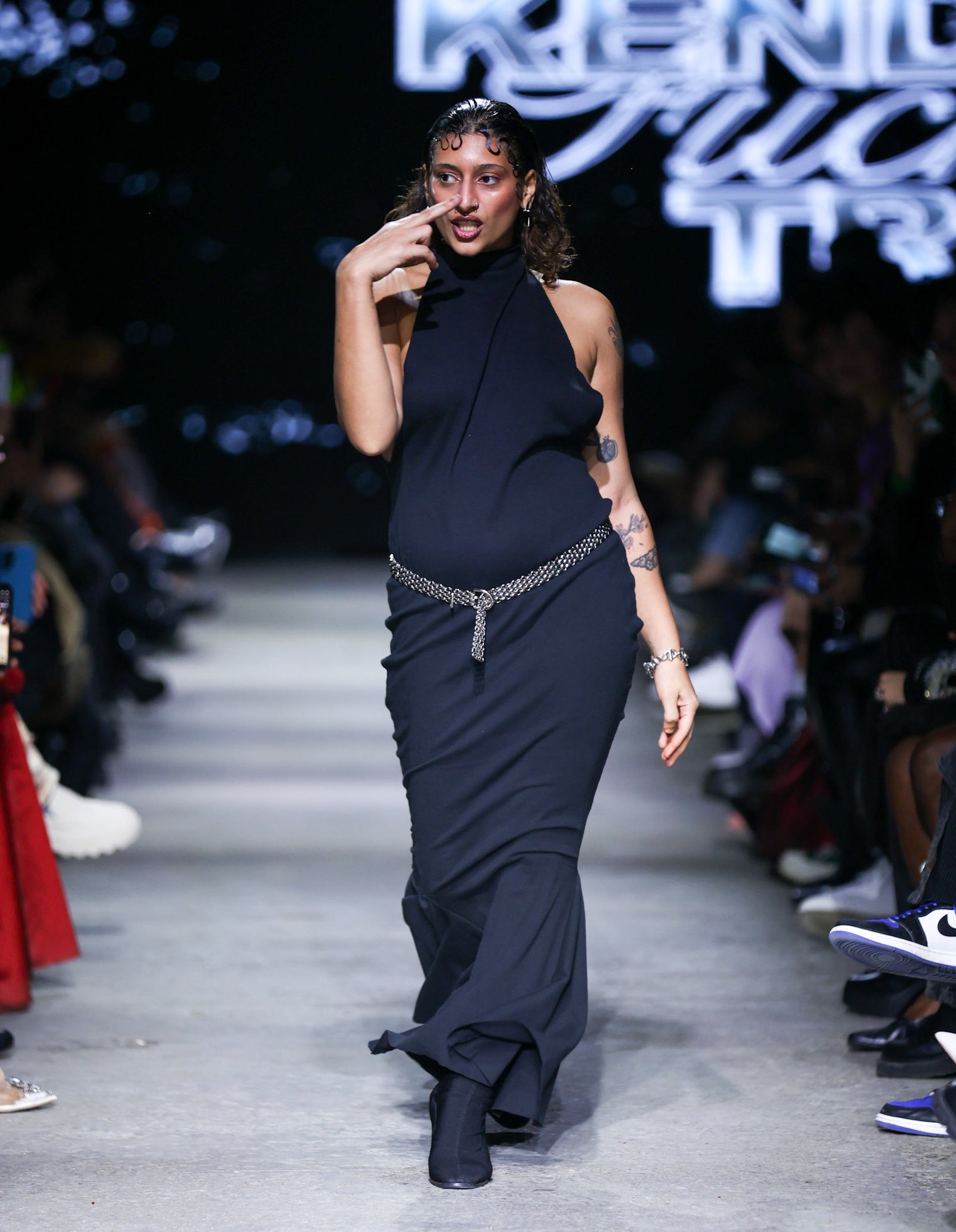 This look started with an idea. How do I give the illusion that there is almost nothing on top, but heavy on the bottom. How do I use a silhouette to trick your eye? Your eyes will naturally start at the top, and then work your way to the bottom. First you will notice the collar, creating the illusion of tension from the start. Then you move down to the chest where you will see there is minimal fabric covering her chest and back. Moving down to the hips you will see a deep side cut out. Making the dress almost exclusively show side boob. The way the dress hugs the hips is truly the only thing preventing the dress from exposing to much… that’s the line I like to blur in my designs. Originally designed to have a pleated skirt on top to give a stacked skirt illusion. This dress just hugs Joy so well, we couldn’t help but show it off.😘
