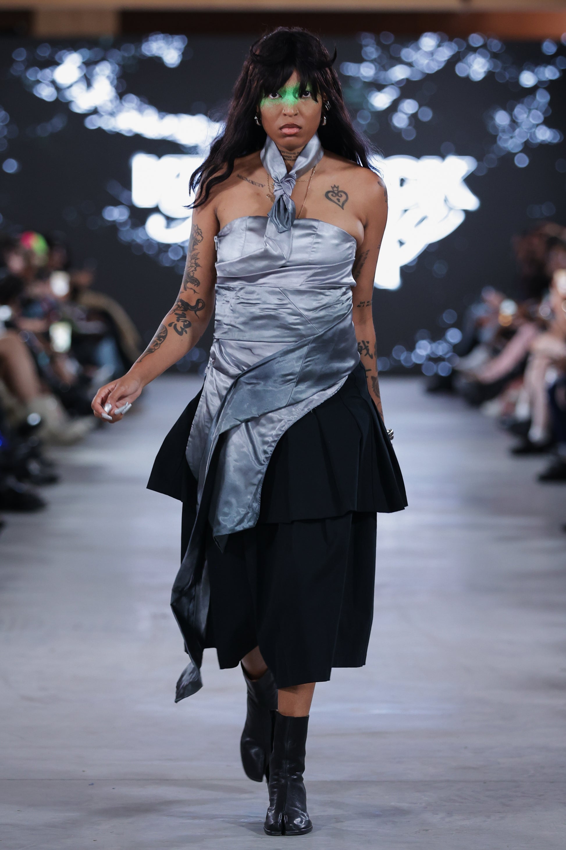 This look is inspired by that. To me capitalism is best represented by the tie. In my opinion, its just a fabric choker. Why is this a signal of power and success? I think a bare chest or a chunky necklace would say a lot more. Its a giant tie corset. It illustrates the confinement I felt and how like a snake. Slowly wraps around you until you hit a breaking point. Then on the bottom, the iconic Mini and Midi skirts I introduced last season. Back in a new way.