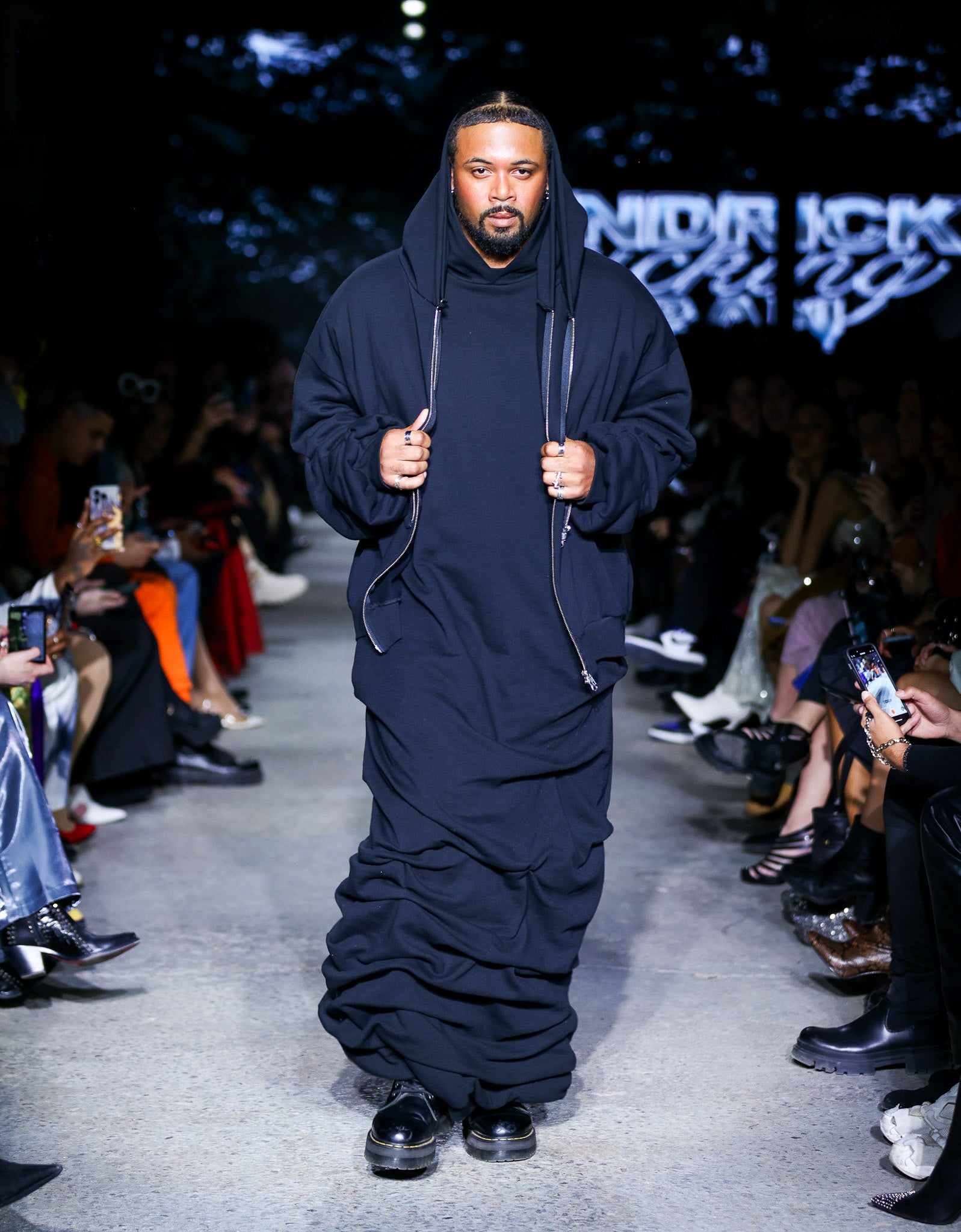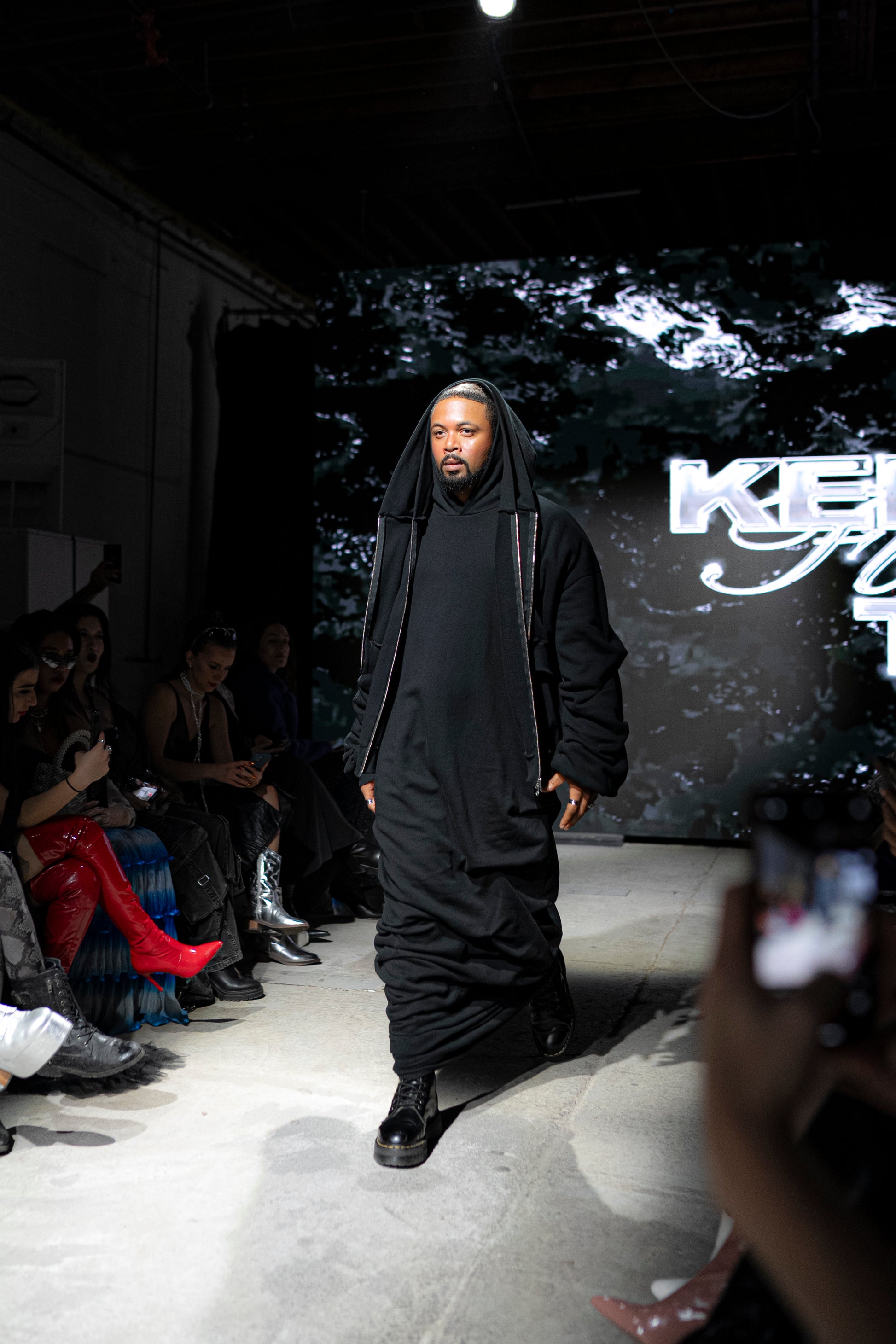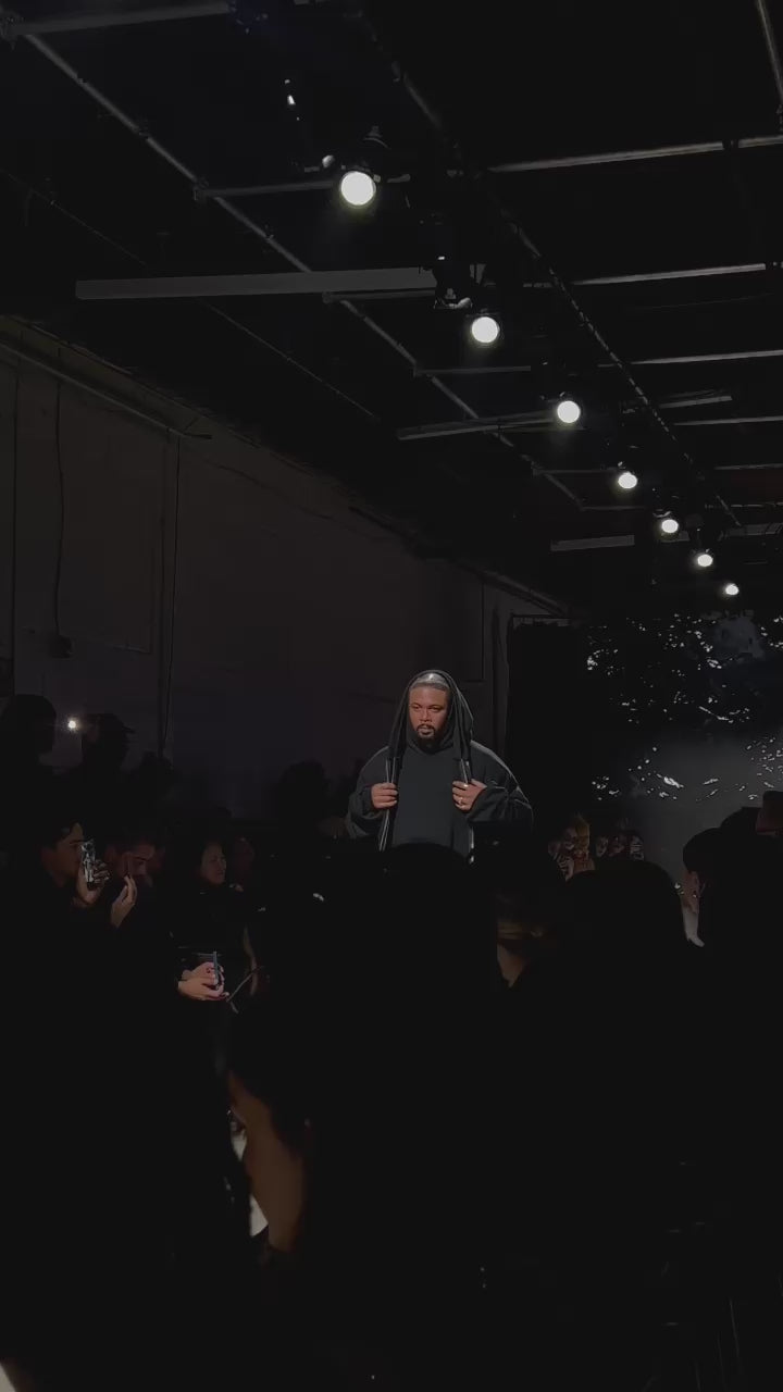 Now this look… has gotten a lot of attention already. Inspired by the feeling of depression and how it makes you want to curl up in bed wearing your favourite hoodies. It started with a feeling. Throughout my life, I have struggled with my mental health in a variety of ways; depression, anxiety, ADHD, and Autism (awaiting official diagnosis). For me, fashion design is all about feeling. When I am designing, I would be lying if I didn’t say I lost a little piece of myself in each piece. This is why I don’t do costume design. I want the item you wear to be a collaboration, my vision and life experiences projected onto you with your individual life experiences. This look is 3 hoodies (yes, yes, another tie back to my THE ICONS: THE HOODIE). A sleeveless hoodie dress, once again double-faced and stacked. When wearing it, it feels like a warm hug. A sleeveless zip-up hoodie, leaning into my more punk radical look. Topped with a stacked sleeve, cropped zip-up hoodie. Heavy on the arms, representing the weight often felt in low points in your life.