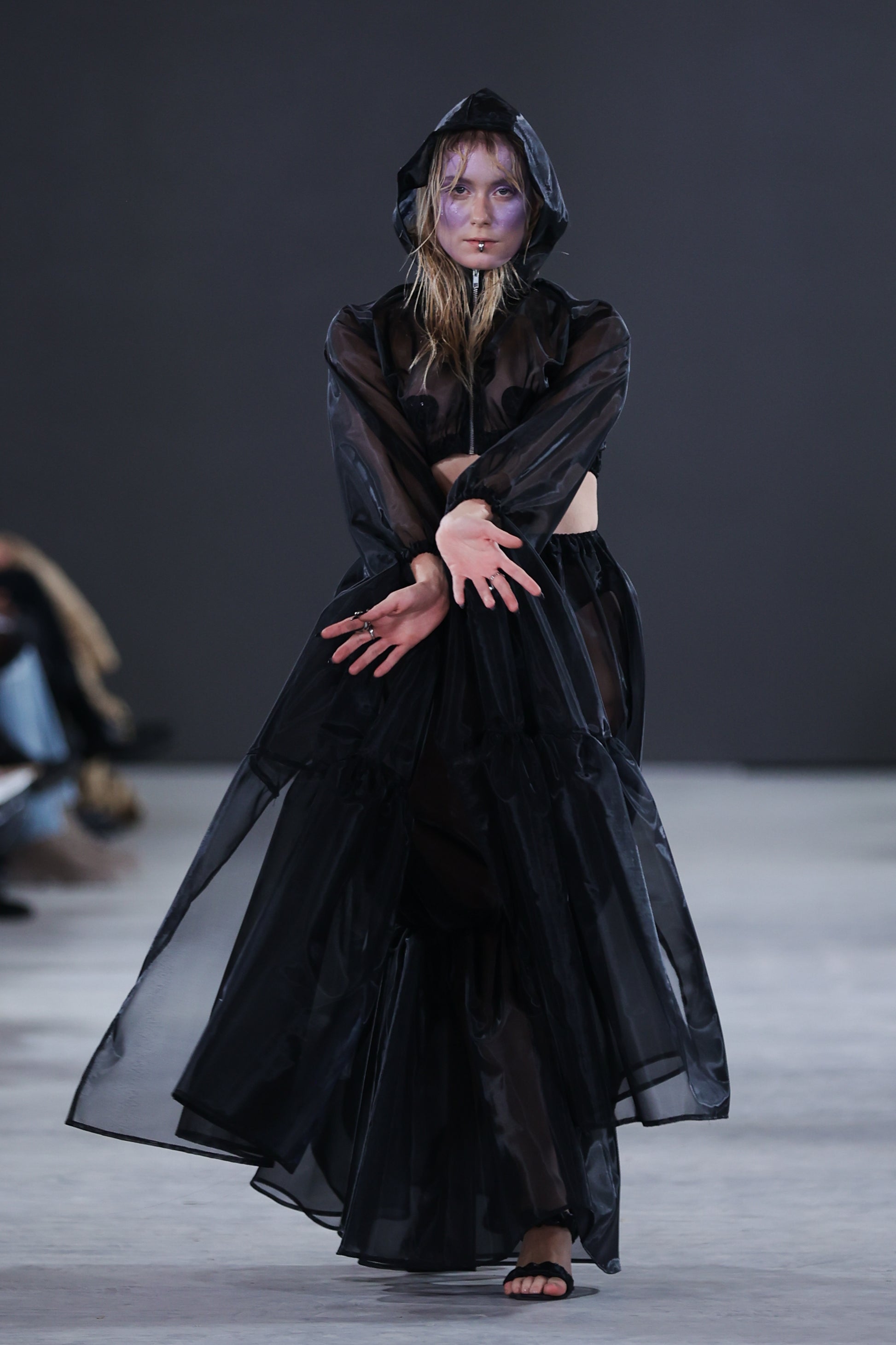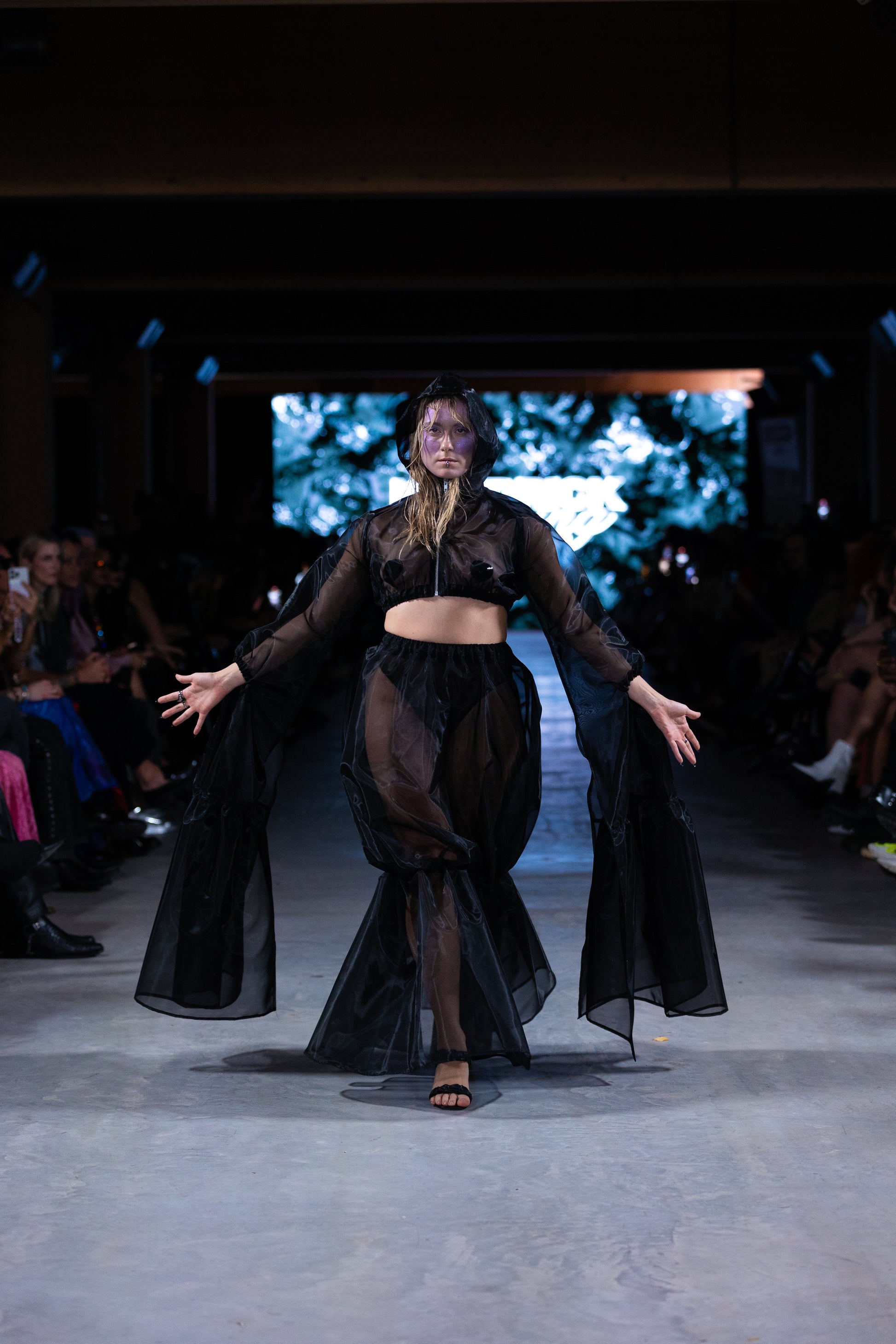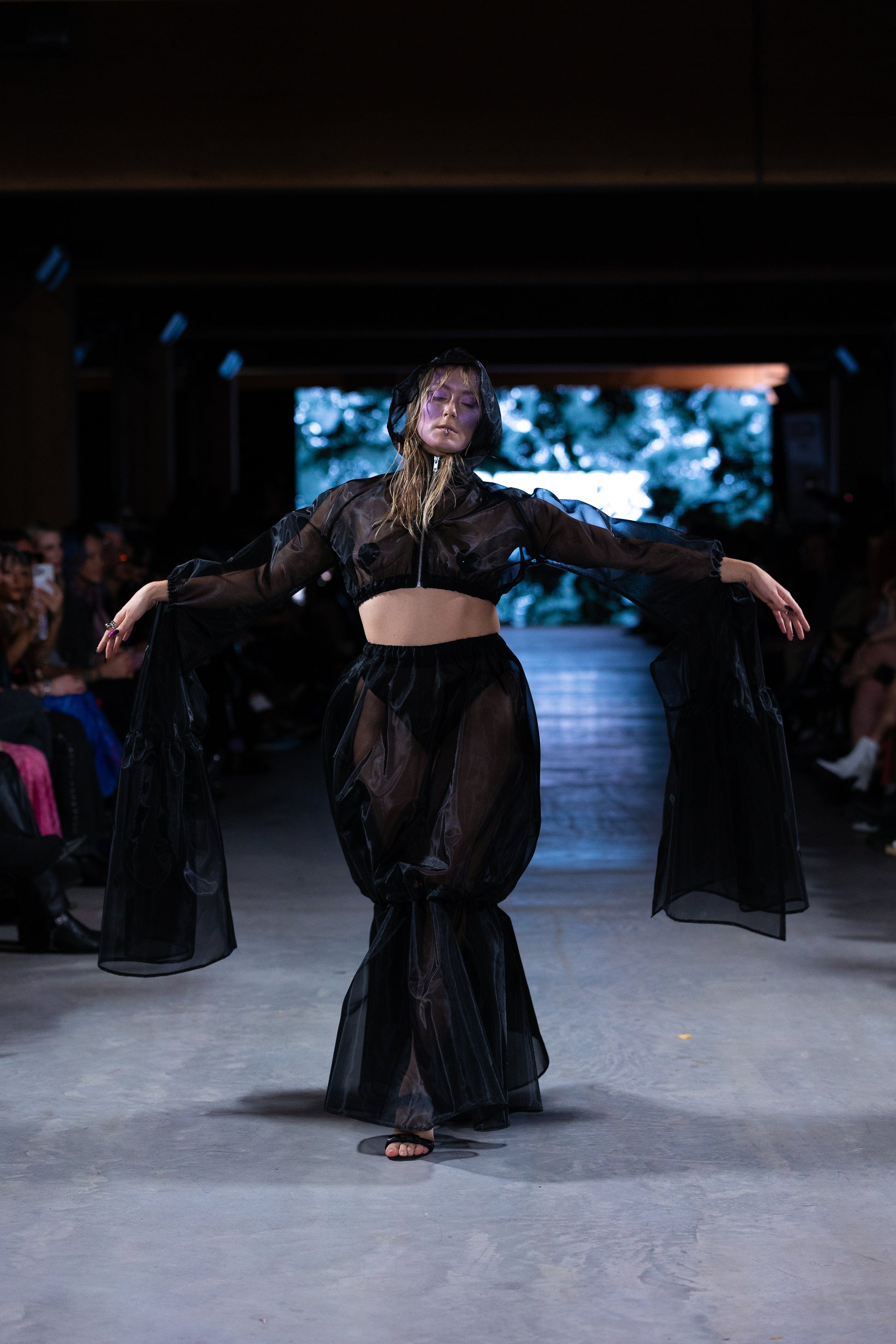 I wanted to keep it classic KENDRICK TRAN, with a streetwear twist. Designed to look like an exaggerated ragglan hoodie. We made it out of organza, so it has a lustrous, see through effect, with the right amount of structure for this shiloutte. Then on the bottom I wanted to make a skirt that still adds shape to the body, but doesn’t hide anything at all.