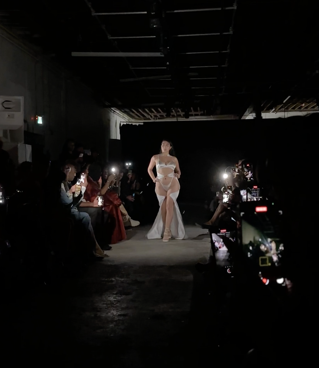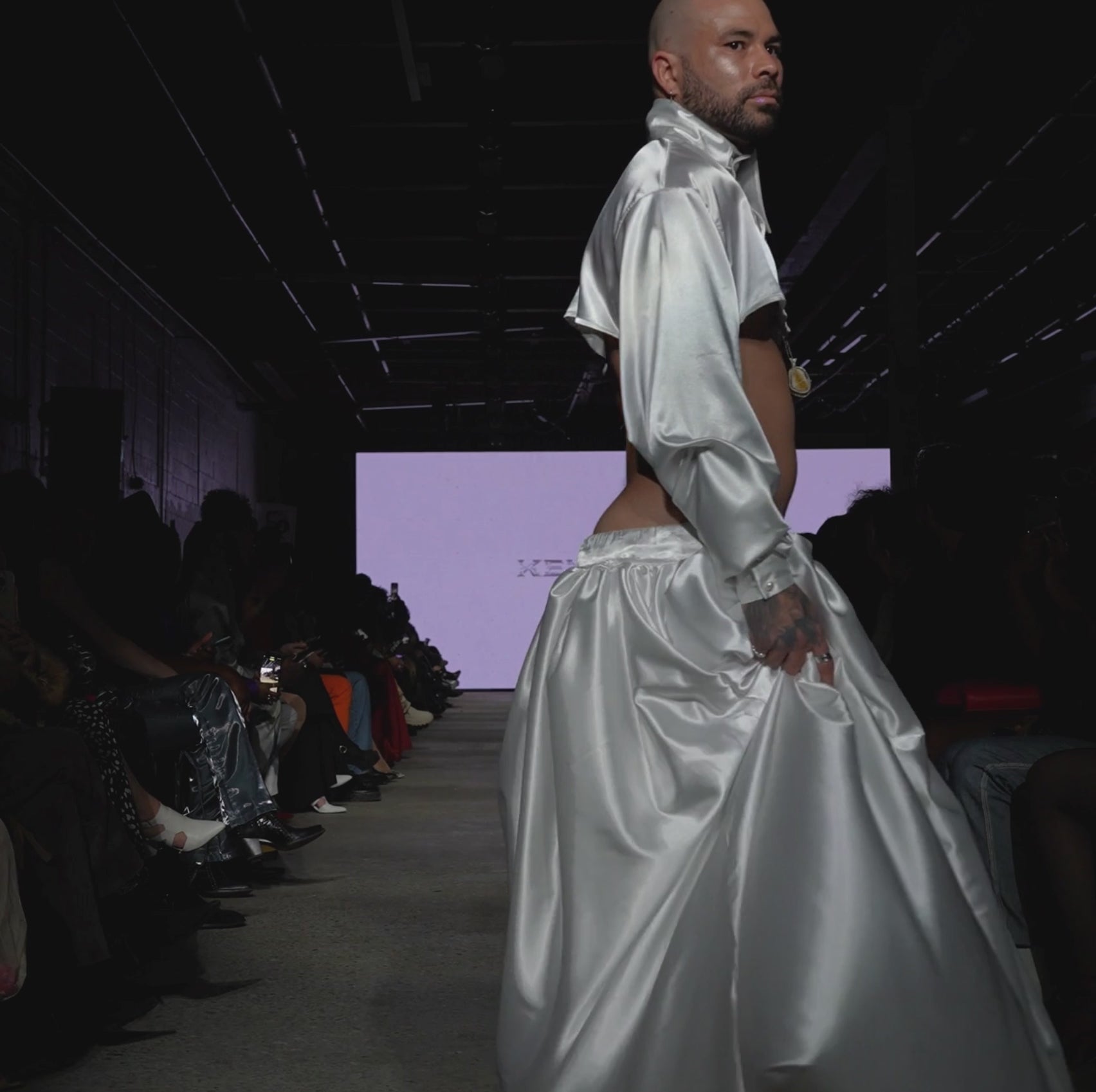 Inspired by the feeling of tension, this “dress” was made to give the illusion that there is nothing on at all. When designing this look, I wanted to combine two kinds of tension. The tension I feel in my brain as a neuro-spicy person, and sexual tension. Idiz is one of the main people that really opened up my heart and helped me understand what it means to be a more authentic and genuine person. Their body positivity and self love, is very prevalent in this look. When I think about the tension I feel in my brain, I think about safety pins holding fabric together. When I think about sexual tension, I think about giving people a taste but not the full fantasy… This look does exactly that. The safety pins are placed on the neck, waist, and thighs to really show off that hourglass shape. Featuring a white satin bra set, giving you a taste of what you’d want to see on your wedding night… complete with a fully covered back and train, because it’s all an illusion.